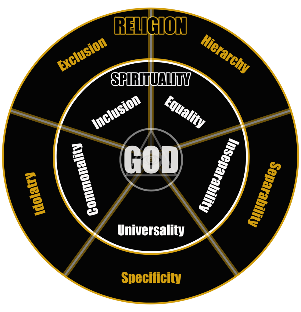 Thus, conflating the words ‘religion’ and ‘spirituality’ is inherently false, and the latter can never be owned by the former. And when pure spiritual philosophers have existed, and have gained great followings free from religion, what invariably happens is that those in power have religionized their spirituality, in the attempt to own it and control its followers. So it is that religion is stamping, categorizing, naming and enforcing a false ownership of that which cannot be owned, is ultimately unnamable, and crosses between and blurs all categorization, for It belongs equally to all infinity.