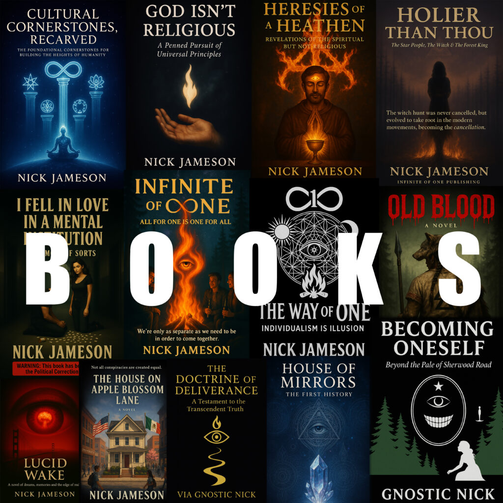 “Infinite of One,” a philosophical novel, is the title of the first book completed by myself, Nick Jameson, the creator of this website and the connected publishing platform. It was through the writing of that book that the core of my ideology was formed, cementing convictions that’ve been with me ever since, and which led me to realize that I’m an ideologue. The title “Infinite of One” alludes to the spiritual belief that, at the heart of existence there’s but One being of pure spiritual, energetic consciousness constituting all of existence, expanded into infinite finite forms of Itself through the existential framework of spacetime, gravitationally Self-attracted before being condensed into matter under sufficient Self-concentrating energetic force.