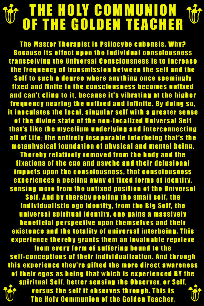 Egotism means the focus on the self, the small, defined definitions of identity that, in their illusions and imparted, misleading delusions, always lead us AWAY from the ability to sense the innate, eternal oneness at the Base of Being, the foundational footing of all truth. The apotheosis of egotism is idolatry, the antithesis of spiritual revelation that pervades religiosity, narrowing the aperture through which the Third Eye might otherwise glimpse truth. By believing that there’s only ever been and only ever will be one ‘Son of God’ able to see and decipher the spiritual nature, the misled believer thereby disempowers his/herself, grossly diminishing his/her capacity to perceive the universal spiritual truth thus concealed. The Secret Truth: EVERYONE has access to an inner prophet, a truth which undermines religious power. For, as Michael Pollan said: “You render the priesthood superfluous if you can talk to God on your own.” What then of the deeper, connected truth, of the fact that we ARE God on our own, a mortal embodiment of the One immortal being. Every self is a manifestation of the Self, the foundation which Pollan alludes to in How to Change Your Mind, in his awareness of his own ego: “There’s another ground upon which to stand.” There is indeed, my fellow seeker. And it’s the ONLY firm footing. Water those roots, and you’ll eventually discover that the fields of the false self, of caring only for oneself, are forever fallow, fruiting but the emptiness of vanity, whilst the Elysian Fields are unearthed when one digs deeper, beneath the perception of independent forms, where false self sinks into the One Root, the awareness of and caring for every form of the Universal Self forever bearing the sweetest fruits. It’s upon these hallowed grounds where what we give makes us not less wealthy, as with the fools’ gold of financial wealth, but, instead, where true wealth is recalled as the bounty within, what Christ called “The Inner Kingdom,” the Heaven ending otherness, where every illusion of what we are dissolves, revealing what we’ve been all along: Infinite of One.