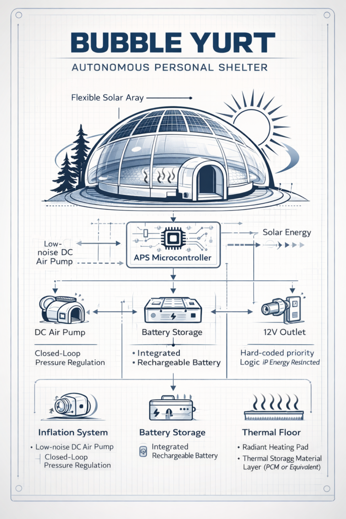 “I have this recurring contemplation of finding, else creating, the perfect impermanent domicile that could serve for everything from setting up a campsite on a property I stay at to welcome guests to being used to address homelessness… Something inexpensive yet as all-inclusive as possible. Recently I envision something plastic that is blown up via a built-in pump, and, ideally, contains a type of solar cell system wherein the cells are integrated, with a built-in battery and plug-in system, such that sun captured during the day by the ‘bubble yurt’ (term I just thought of for it) could be used to power a small heating element also built-into the bubble yurt at night, and/or could allow the resident to charge a cell phone, etc… I think that I’d want the cleanest/most efficient transfer of the solar energy captured during daylight hours into a heating pad built into the floor. The design would be based upon as convenient and efficient an operation as possible. On that level, ideally the bubble yurt would be entirely automated; that is, the user wouldn’t even need any knowledge to operate and maintain it. I’m thinking this largely from my own knowledge of people suffering from mental illnesses and related stresses connected to homelessness etc. You wouldn’t want them to have to remember to do anything for the ‘Bubble Yurt’ to be effective. Ideally it would even inflate itself and keep itself inflated based upon some sort of built in sensor… It would have some element that feeds the energy collected during the day to where it’s needed most (inflation/warmth, then any extra fed into a battery with a meter allowing the resident to read how much extra energy they have for plug-ins).”